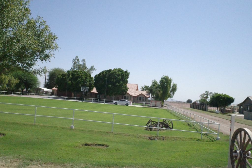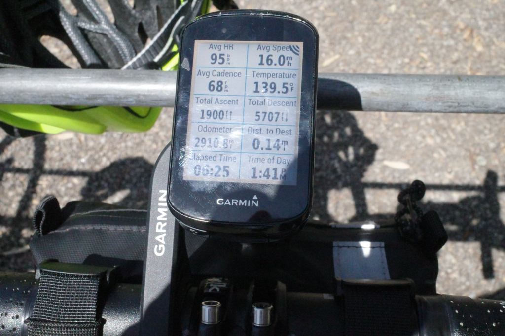 Still a relatively short day (about 85 miles) but seriously hot for much of the day, close to 110F (42C). The Relive map above shows the stark contrast between the desert and the heavily irrigated fields and lawns, as do the pictures.